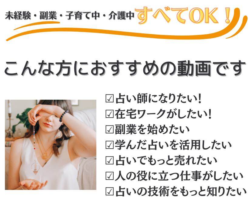 この動画講座は、大好きな占いの世界に没頭して、自分らしい働き方を追求したいけれど、不安があるという人に向けて、占いの世界の真実を正しく理解していただくための無料動画です。