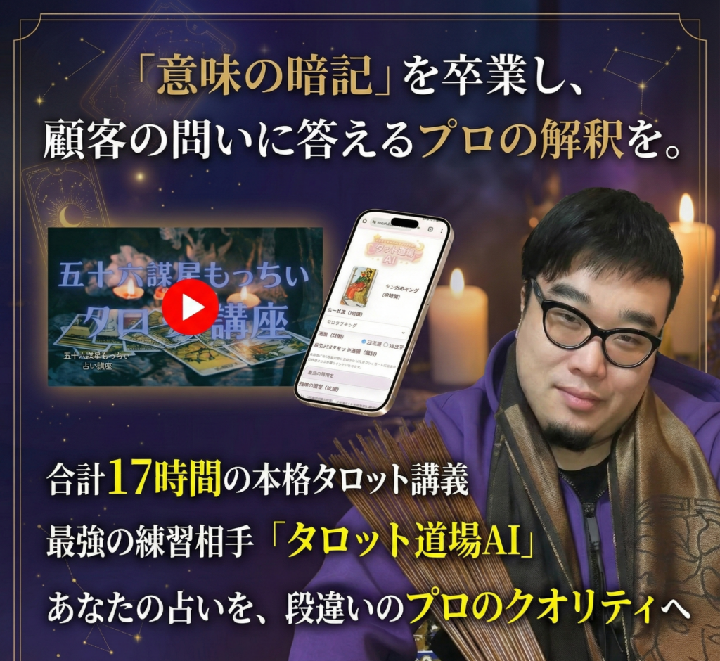 鑑定歴19年のもっちぃが、自身の占いロジックをプログラミングして作り上げた「タロット道場AI」を使って、いつでもアウトプットの練習ができます。